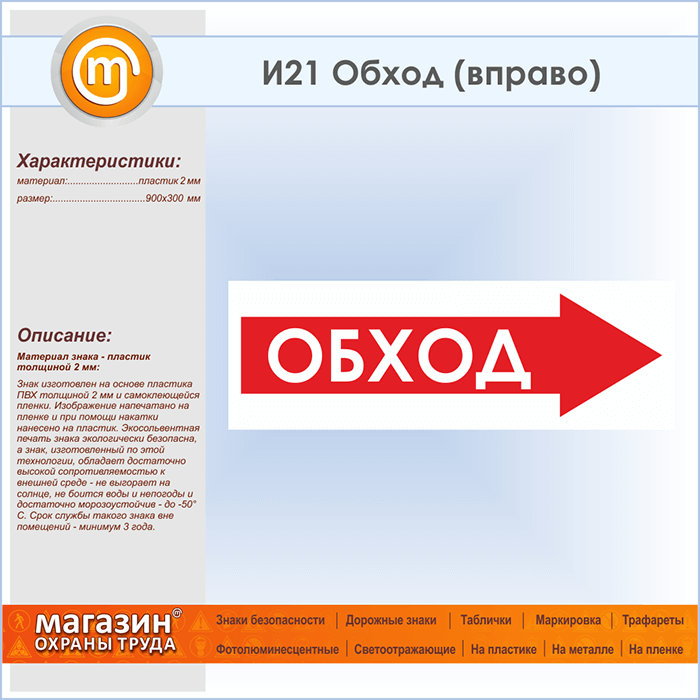 Знак «Обход (вправо)», И21 (пластик, 900х300 мм) в Альметьевске купить