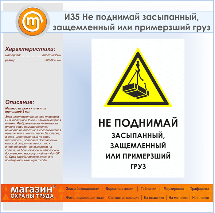 Знак «Не поднимай засыпанный, защемленный или примерзший груз», И35 (пластик, 600х900 мм) в Альметьевске купить