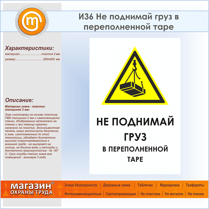 Знак «Не поднимай груз в переполненной таре», И36 (пластик, 600х900 мм) в Альметьевске купить