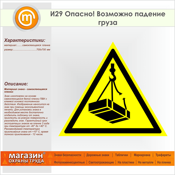 Знак «Опасно! Возможно падение груза», И29 (пленка, сторона 700 мм) в Альметьевске купить