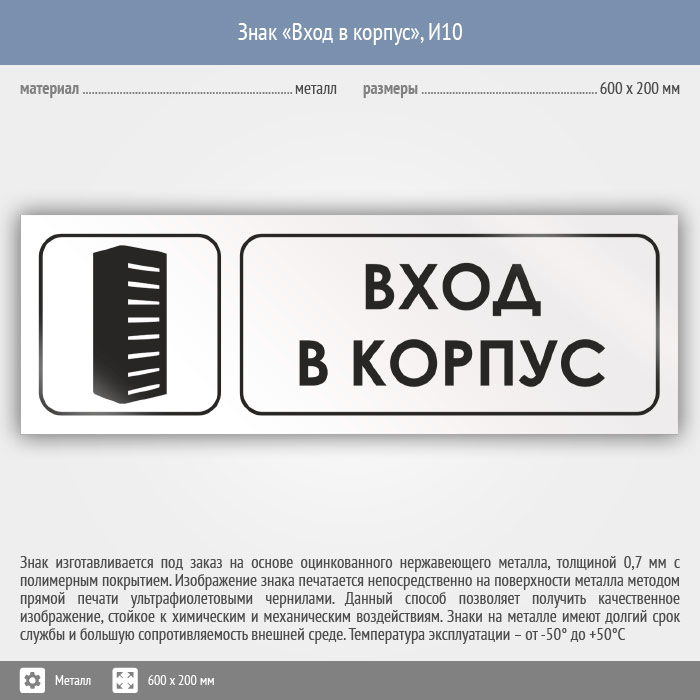 Знак «Вход в корпус», И10 (металл, 600х200 мм) в Альметьевске купить