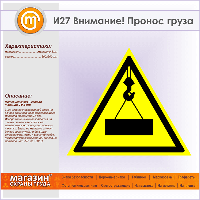 Знак «Внимание! Пронос груза», И27 (металл, сторона 300 мм) в Альметьевске купить