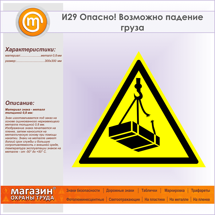 Знак «Опасно! Возможно падение груза», И29 (металл, сторона 300 мм) в Альметьевске купить