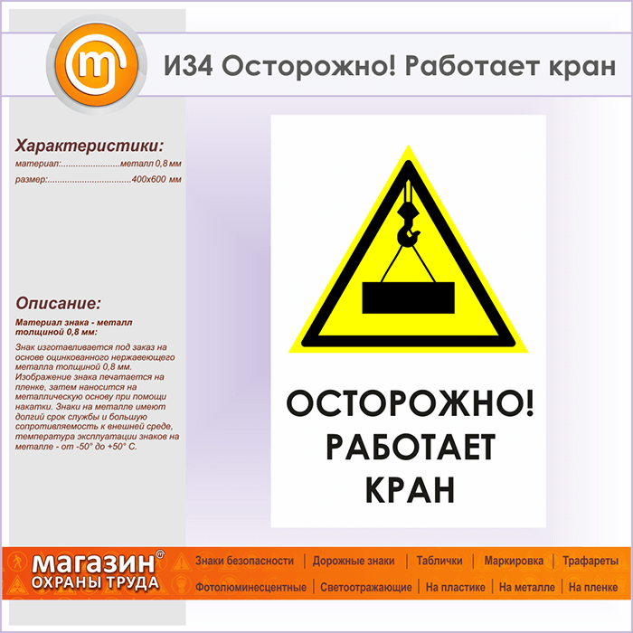 Знак «Осторожно! Работает кран», И34 (металл, 400х600 мм) в Альметьевске купить