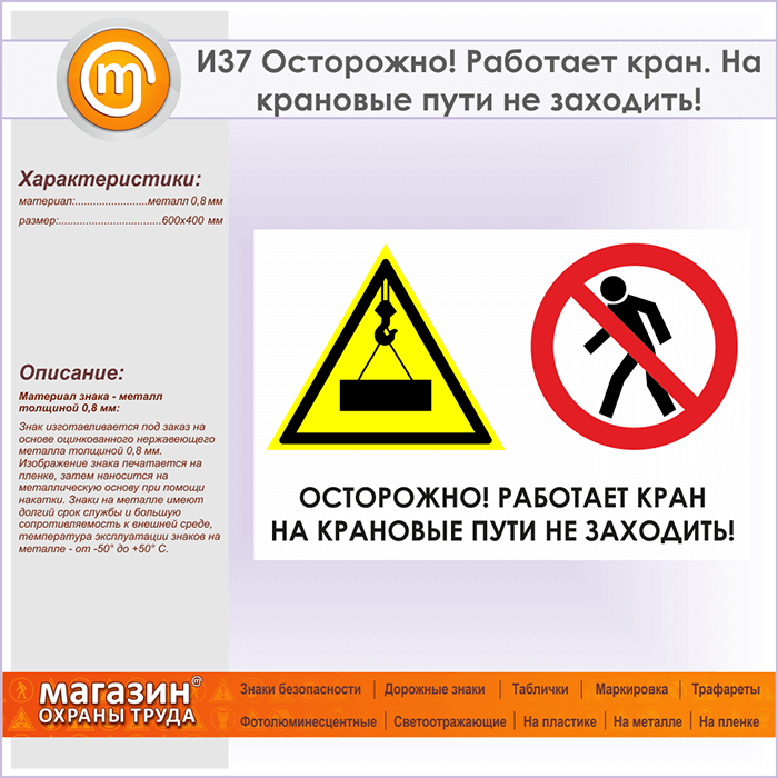 Знак «Осторожно! Работает кран. На крановые пути не заходить!», И37 (металл, 600х400 мм) в Альметьевске купить