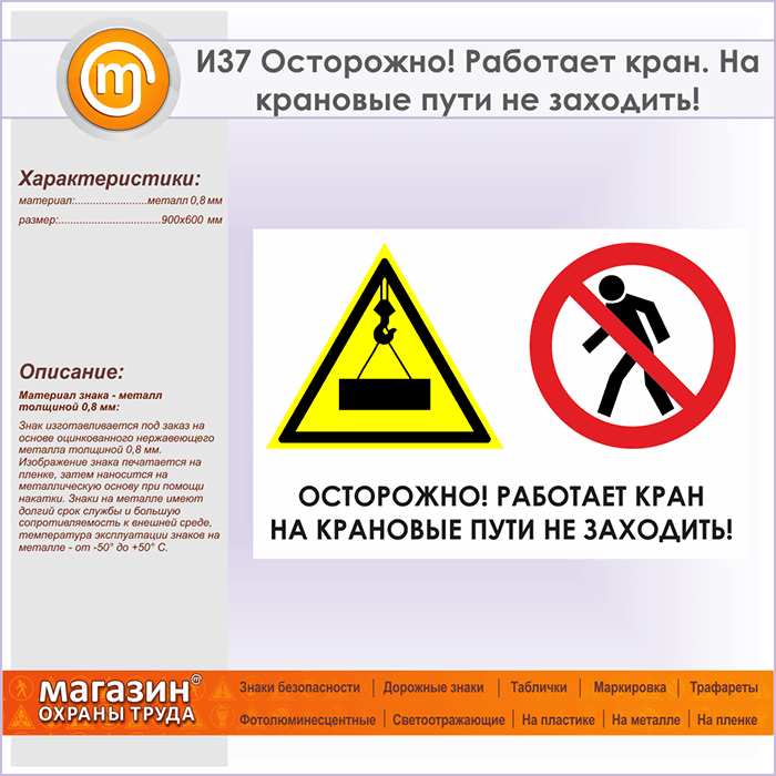 Знак «Осторожно! Работает кран. На крановые пути не заходить!», И37 (металл, 900х600 мм) в Альметьевске купить