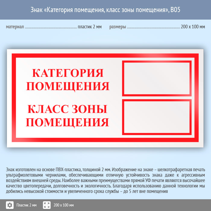 Знак «Категория помещения, класс зоны помещения», B05 (пластик, 200х100 мм) в Альметьевске купить