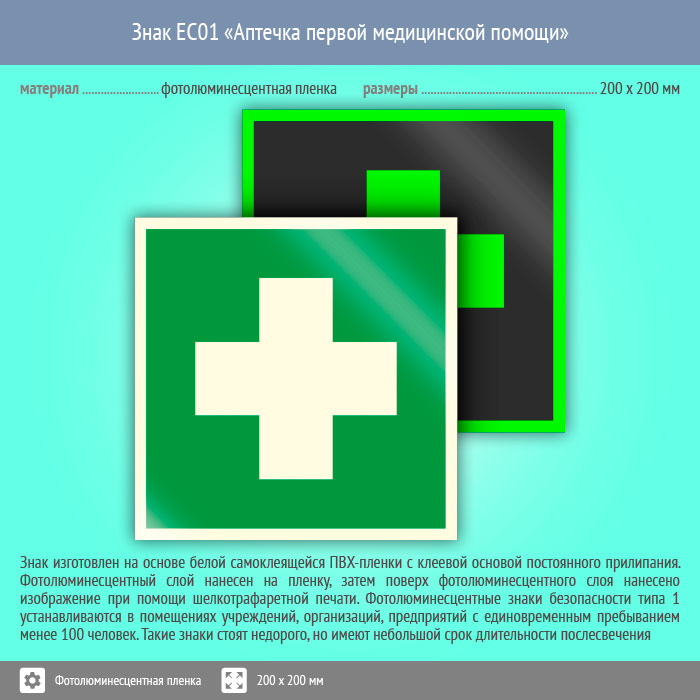 Знак EC01 «Аптечка первой медицинской помощи» (фотолюминесцентная пленка, 200х200 мм) в Альметьевске купить