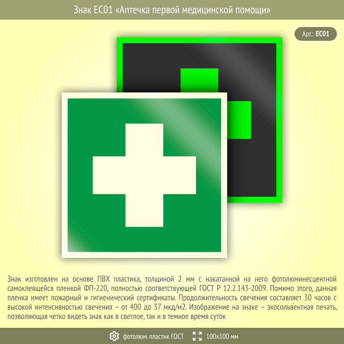 Знак EC01 «Аптечка первой медицинской помощи» (фотолюминесцентный пластик ГОСТ 34428-2018, 100х100 мм) в Альметьевске купить