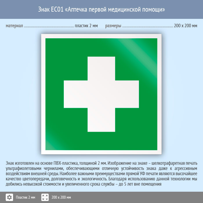 Знак EC01 «Аптечка первой медицинской помощи» (пластик, 200х200 мм) в Альметьевске купить