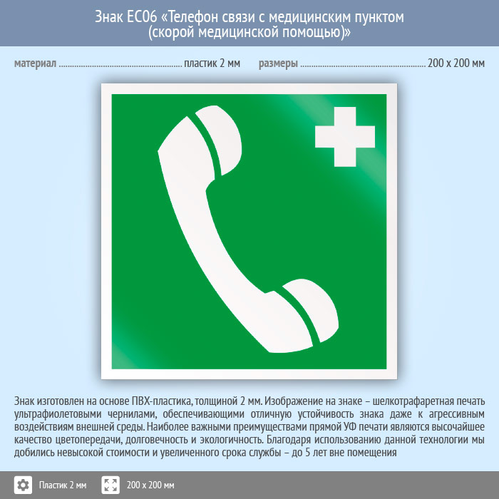 Знак EC06 «Телефон связи с медицинским пунктом (скорой медицинской помощью)» (пластик, 200х200 мм) в Альметьевске купить