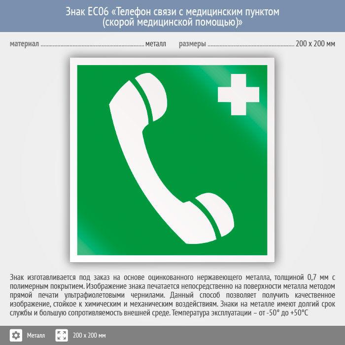 Знак EC06 «Телефон связи с медицинским пунктом (скорой медицинской помощью)» (металл, 200х200 мм) в Альметьевске купить