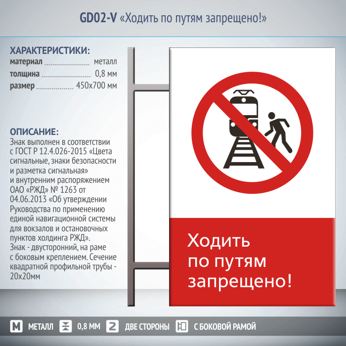 Знак «Ходить по путям запрещено!», GD02-V (двусторонний вертикальный, 450х700 мм, металл, на раме с боковым креплением) в Альметьевске купить