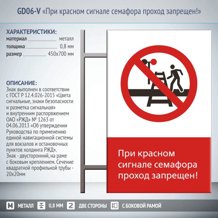 Знак «При красном сигнале семафора проход запрещен!», GD06-V (двусторонний вертикальный, 450х700 мм, металл, на раме с боковым креплением) в Альметьевске купить
