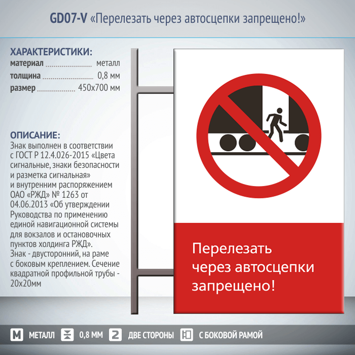 Знак «Перелезать через автосцепки запрещено!», GD07-V (двусторонний вертикальный, 450х700 мм, металл, на раме с боковым креплением) в Альметьевске купить