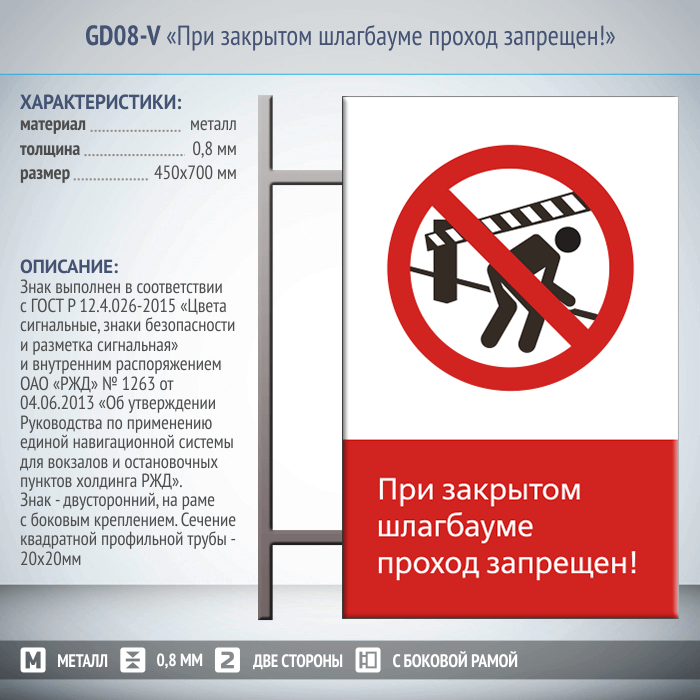 Знак «При закрытом шлагбауме проход запрещен!», GD08-V (двусторонний вертикальный, 450х700 мм, металл, на раме с боковым креплением) в Альметьевске купить