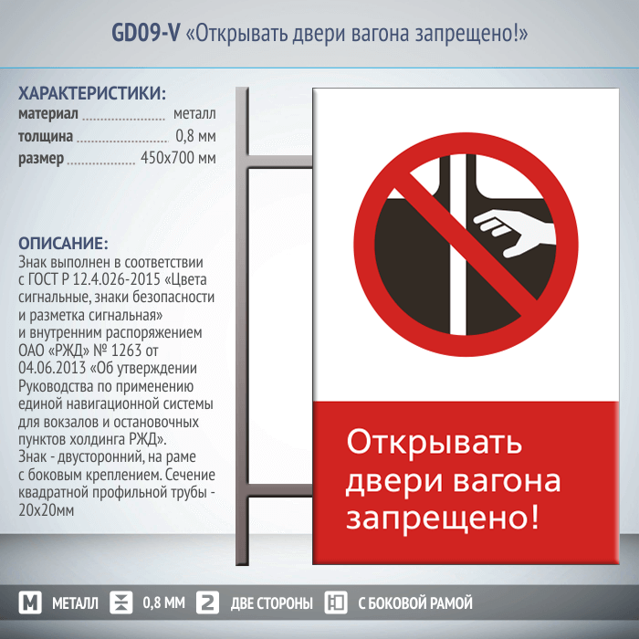 Знак «Открывать двери вагона запрещено!», GD09-V (двусторонний вертикальный, 450х700 мм, металл, на раме с боковым креплением) в Альметьевске купить