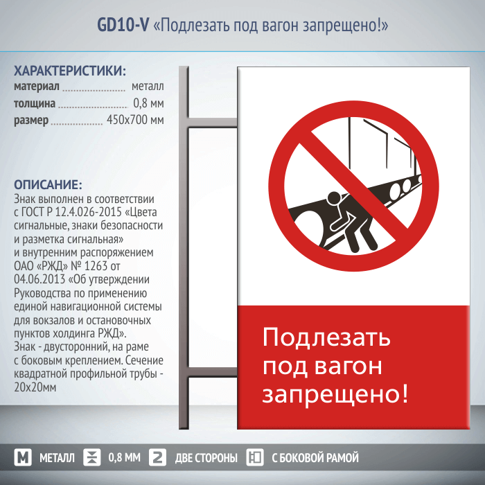 Знак «Подлезать под вагон запрещено!», GD10-V (двусторонний вертикальный, 450х700 мм, металл, на раме с боковым креплением) в Альметьевске купить