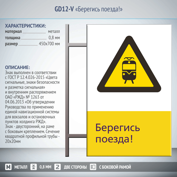 Знак «Берегись поезда!», GD12-V (двусторонний вертикальный, 450х700 мм, металл, на раме с боковым креплением) в Альметьевске купить