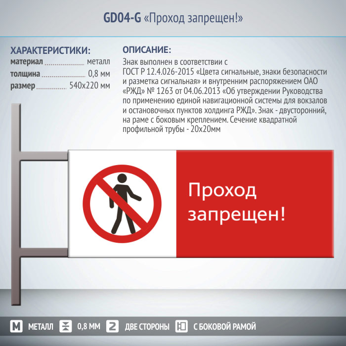Знак «Проход запрещен!», GD04-G (двусторонний горизонтальный, 540х220 мм, металл, на раме с боковым креплением) в Альметьевске купить