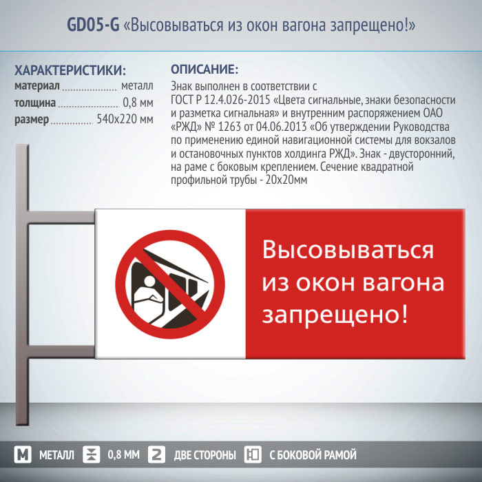 Знак «Высовываться из окон вагона запрещено!», GD05-G (двусторонний горизонтальный, 540х220 мм, металл, на раме с боковым креплением) в Альметьевске купить