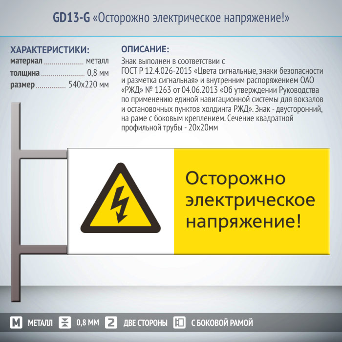 Знак «Осторожно электрическое напряжение!», GD13-G (двусторонний горизонтальный, 540х220 мм, металл, на раме с боковым креплением) в Альметьевске купить