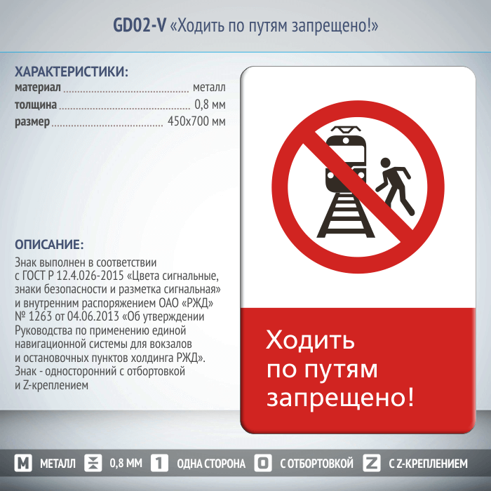 Знак «Ходить по путям запрещено!», GD02-V (односторонний вертикальный, 450х700 мм, металл, с отбортовкой и Z-креплением) в Альметьевске купить