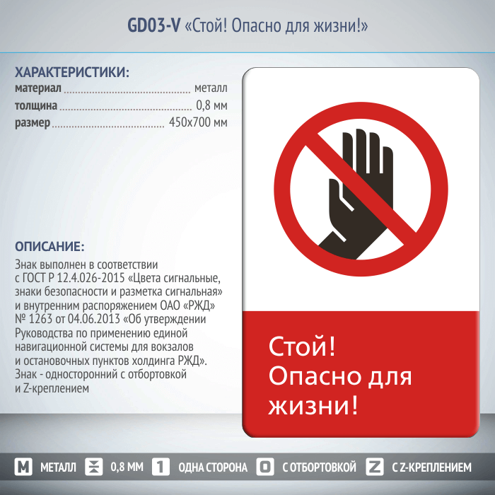 Знак «Стой! Опасно для жизни!», GD03-V (односторонний вертикальный, 450х700 мм, металл, с отбортовкой и Z-креплением) в Альметьевске купить