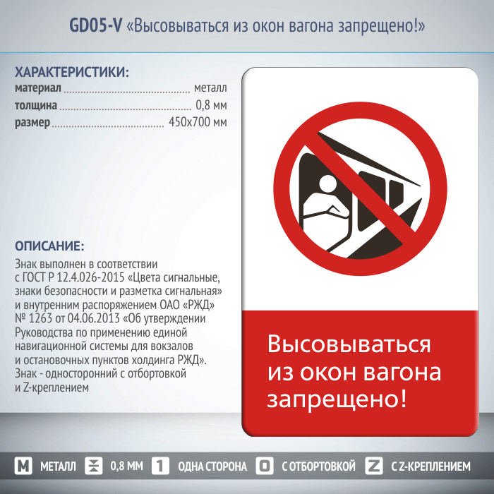 Знак «Высовываться из окон вагона запрещено!», GD05-V (односторонний вертикальный, 450х700 мм, металл, с отбортовкой и Z-креплением) в Альметьевске купить