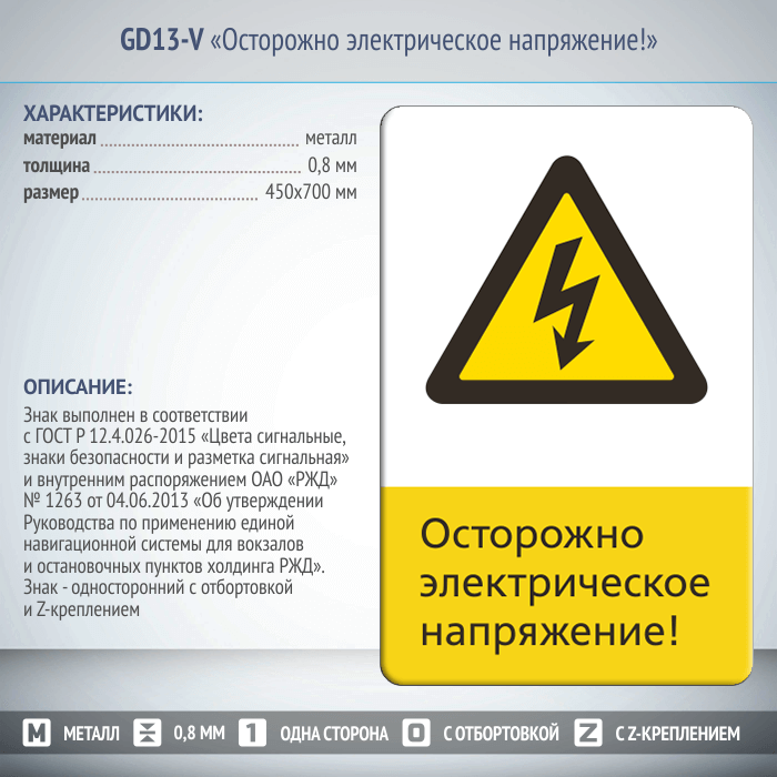 Знак «Осторожно электрическое напряжение!», GD13-V (односторонний вертикальный, 450х700 мм, металл, с отбортовкой и Z-креплением) в Альметьевске купить