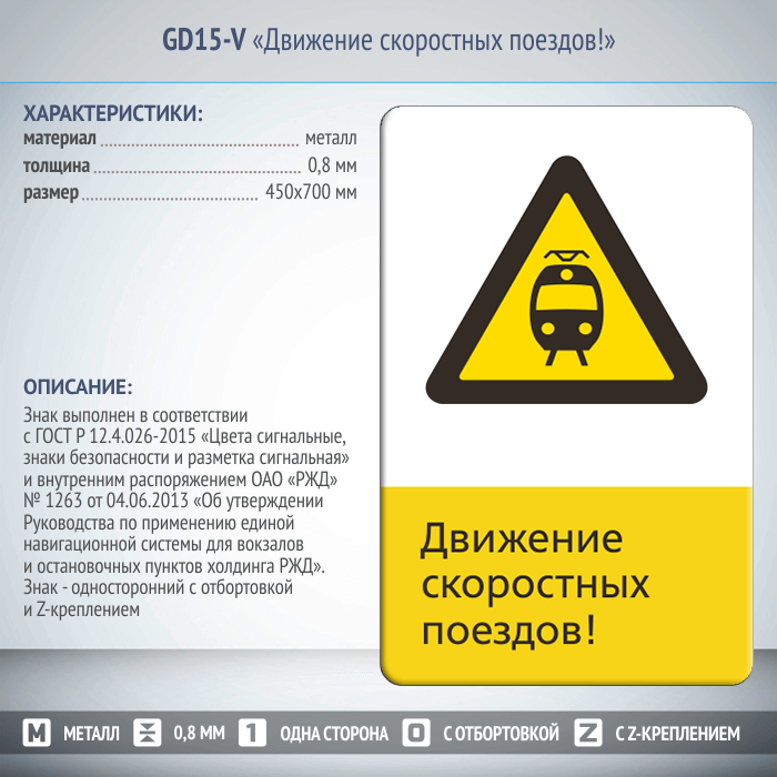Знак «Движение скоростных поездов!», GD15-V (односторонний вертикальный, 450х700 мм, металл, с отбортовкой и Z-креплением) в Альметьевске купить