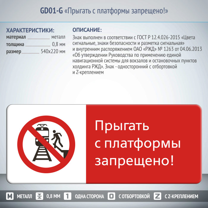 Знак «Прыгать с платформы запрещено!», GD01-G (односторонний горизонтальный, 540х220 мм, металл, с отбортовкой и Z-креплением) в Альметьевске купить