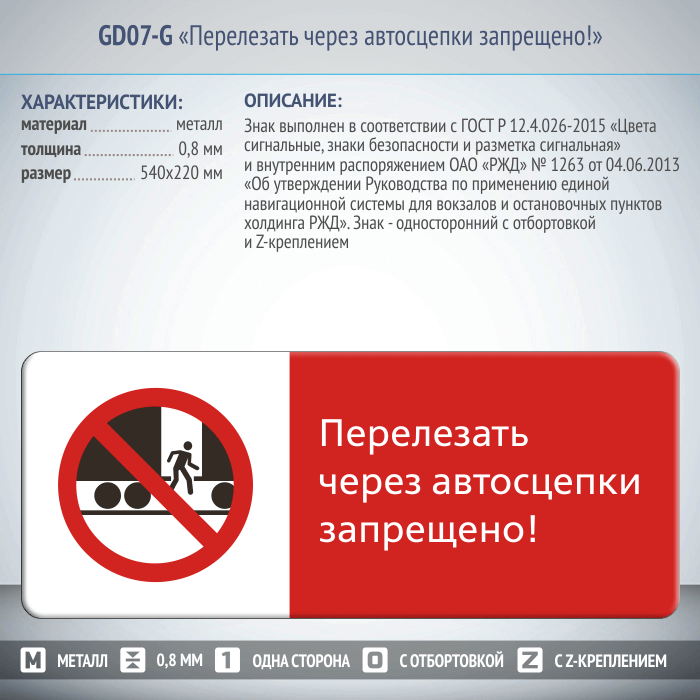 Знак «Перелезать через автосцепки запрещено!», GD07-G (односторонний горизонтальный, 540х220 мм, металл, с отбортовкой и Z-креплением) в Альметьевске купить