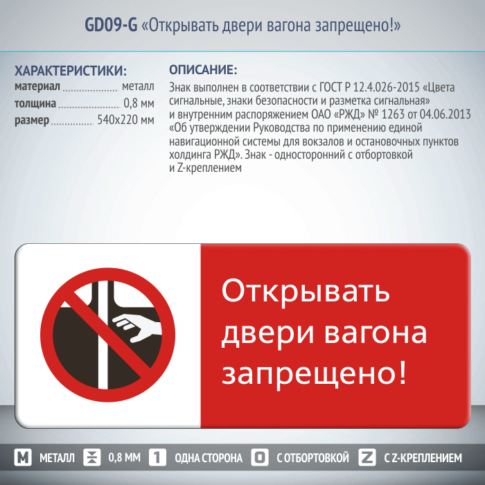 Знак «Открывать двери вагона запрещено!», GD09-G (односторонний горизонтальный, 540х220 мм, металл, с отбортовкой и Z-креплением) в Альметьевске купить