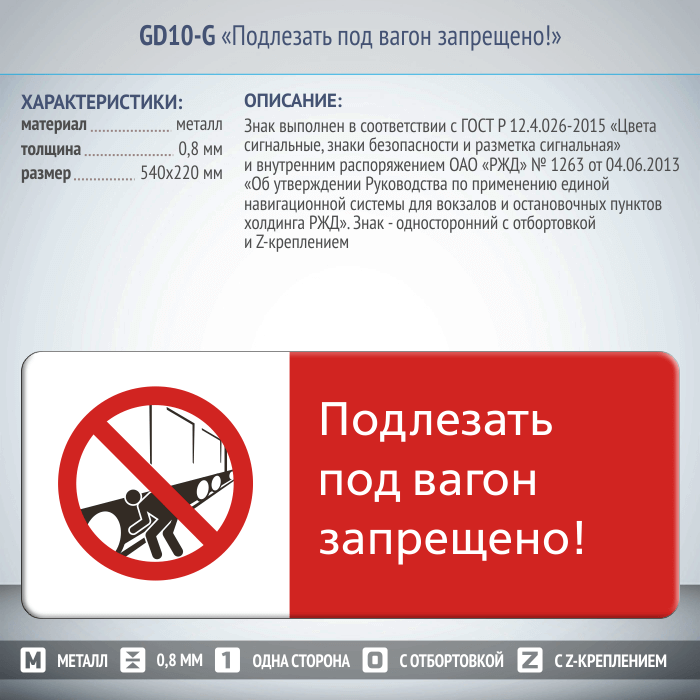 Знак «Подлезать под вагон запрещено!», GD10-G (односторонний горизонтальный, 540х220 мм, металл, с отбортовкой и Z-креплением) в Альметьевске купить