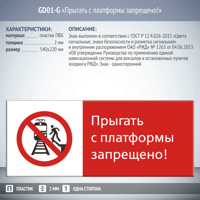 Знак «Прыгать с платформы запрещено!», GD01-G (односторонний горизонтальный, 540х220 мм, пластик 2 мм) в Альметьевске купить