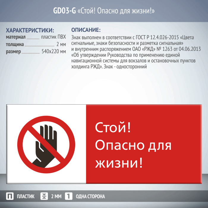 Знак «Стой! Опасно для жизни!», GD03-G (односторонний горизонтальный, 540х220 мм, пластик 2 мм) в Альметьевске купить