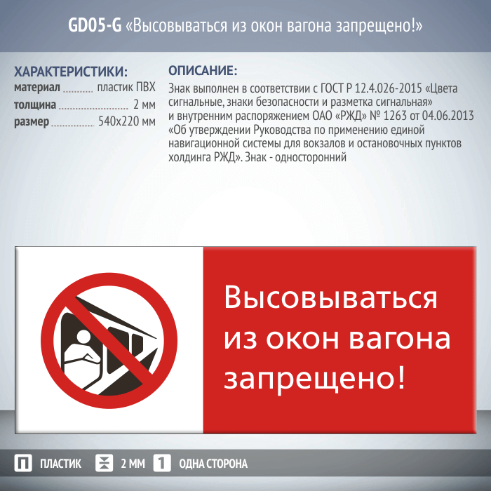 Знак «Высовываться из окон вагона запрещено!», GD05-G (односторонний горизонтальный, 540х220 мм, пластик 2 мм) в Альметьевске купить