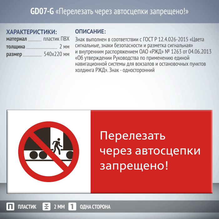Знак «Перелезать через автосцепки запрещено!», GD07-G (односторонний горизонтальный, 540х220 мм, пластик 2 мм) в Альметьевске купить