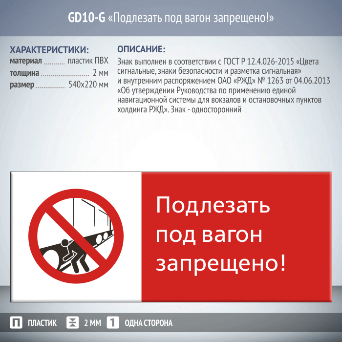 Знак «Подлезать под вагон запрещено!», GD10-G (односторонний горизонтальный, 540х220 мм, пластик 2 мм) в Альметьевске купить