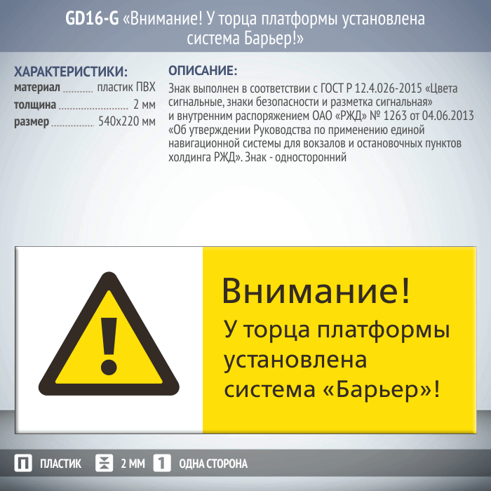 Знак «Внимание! У торца платформы установлена система Барьер!», GD16-G (односторонний горизонтальный, 540х220 мм, пластик 2 мм) в Альметьевске купить