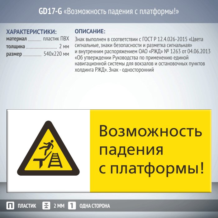 Знак «Возможность падения с платформы!», GD17-G (односторонний горизонтальный, 540х220 мм, пластик 2 мм) в Альметьевске купить