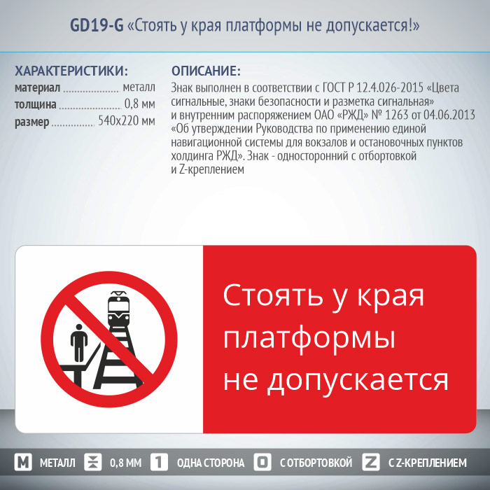 Знак «Стоять у края платформы не допускается!», GD19-G (односторонний горизонтальный, 540х220 мм, металл, с отбортовкой и Z-креплением) в Альметьевске купить