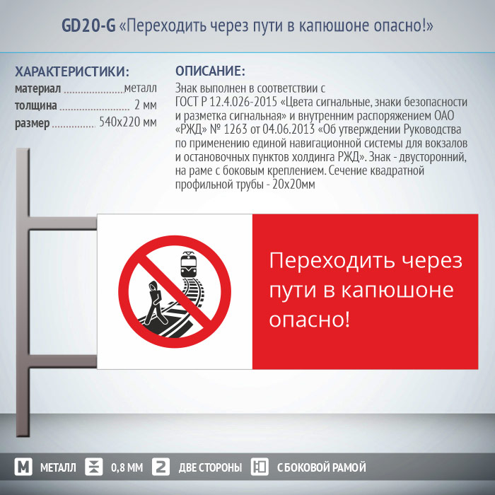 Знак «Переходить через пути в капюшоне опасно!», GD20-G (двусторонний горизонтальный, 540х220 мм, металл, на раме с боковым креплением) в Альметьевске купить