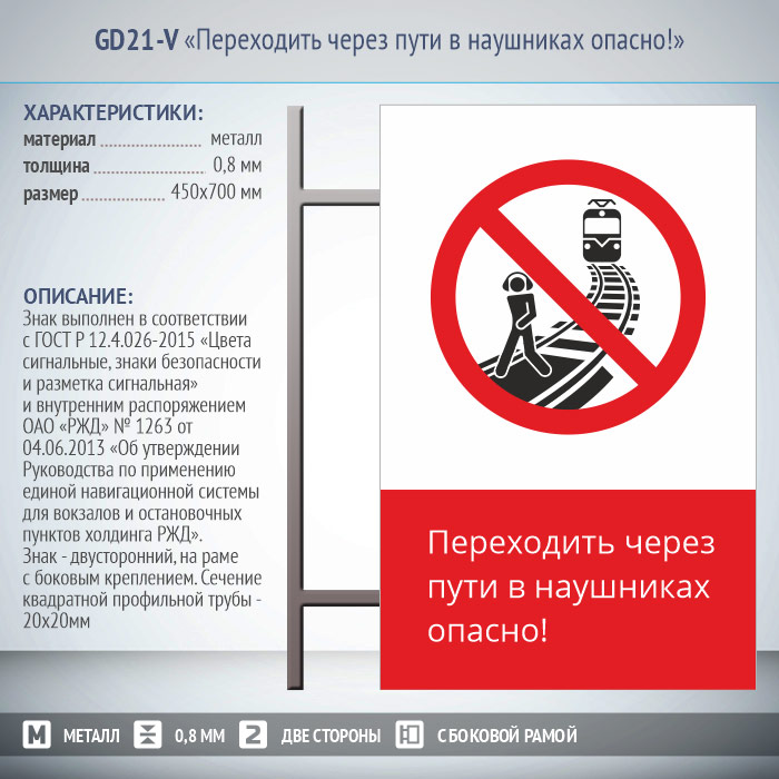 Знак «Переходить через пути в наушниках опасно!», GD21-V (двусторонний вертикальный, 450х700 мм, металл, на раме с боковым креплением) в Альметьевске купить
