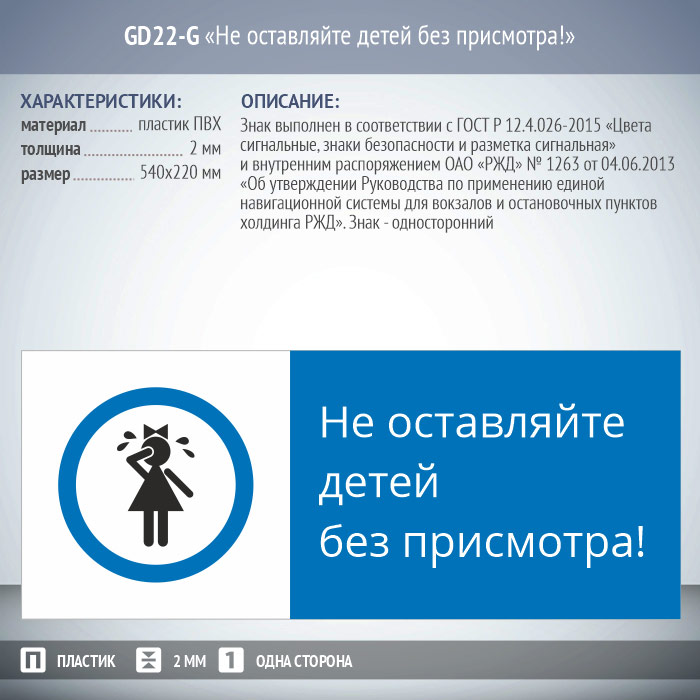 Знак «Не оставляйте детей без присмотра!», GD22-G (односторонний горизонтальный, 540х220 мм, пластик 2 мм) в Альметьевске купить