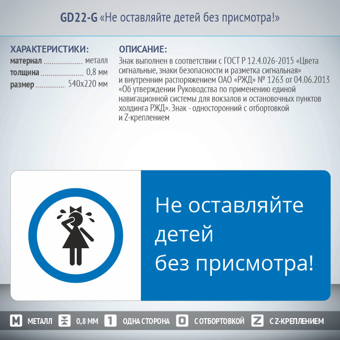 Знак «Не оставляйте детей без присмотра!», GD22-G (односторонний горизонтальный, 540х220 мм, металл, с отбортовкой и Z-креплением) в Альметьевске купить