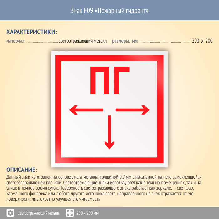 Знак F09 «Пожарный гидрант» (светоотражающий металл, 200х200 мм) в Альметьевске купить