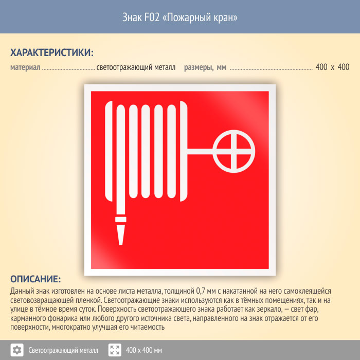 Знак F02 «Пожарный кран» (светоотражающий металл, 400х400 мм) в Альметьевске купить