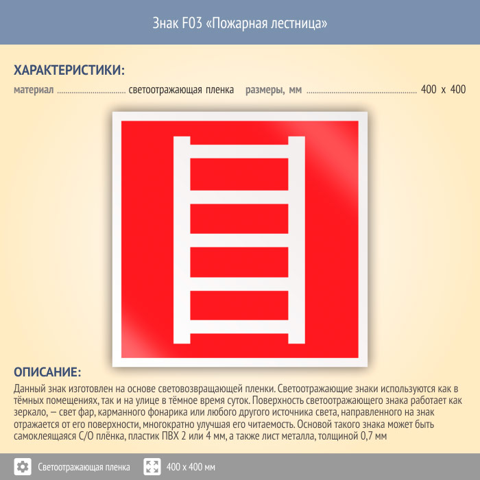 Знак F03 «Пожарная лестница» (светоотражающая пленка, 400х400 мм) в Альметьевске купить